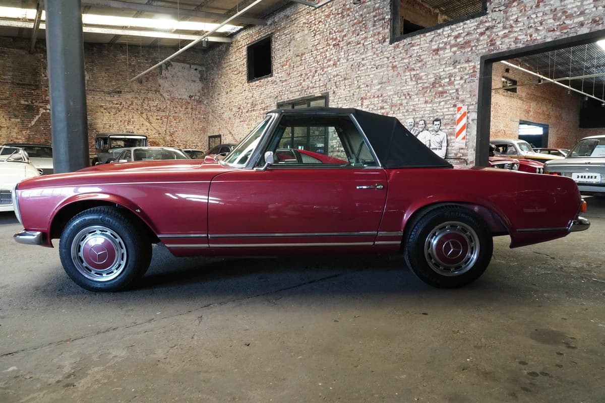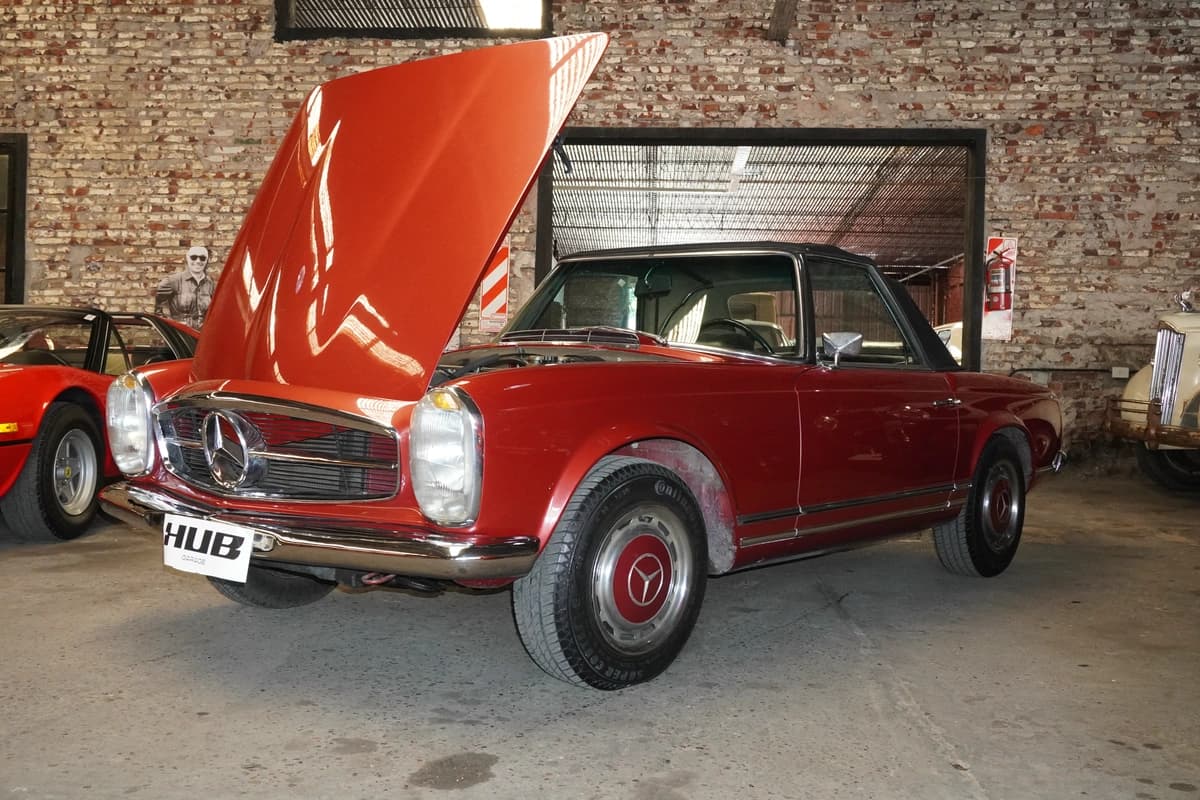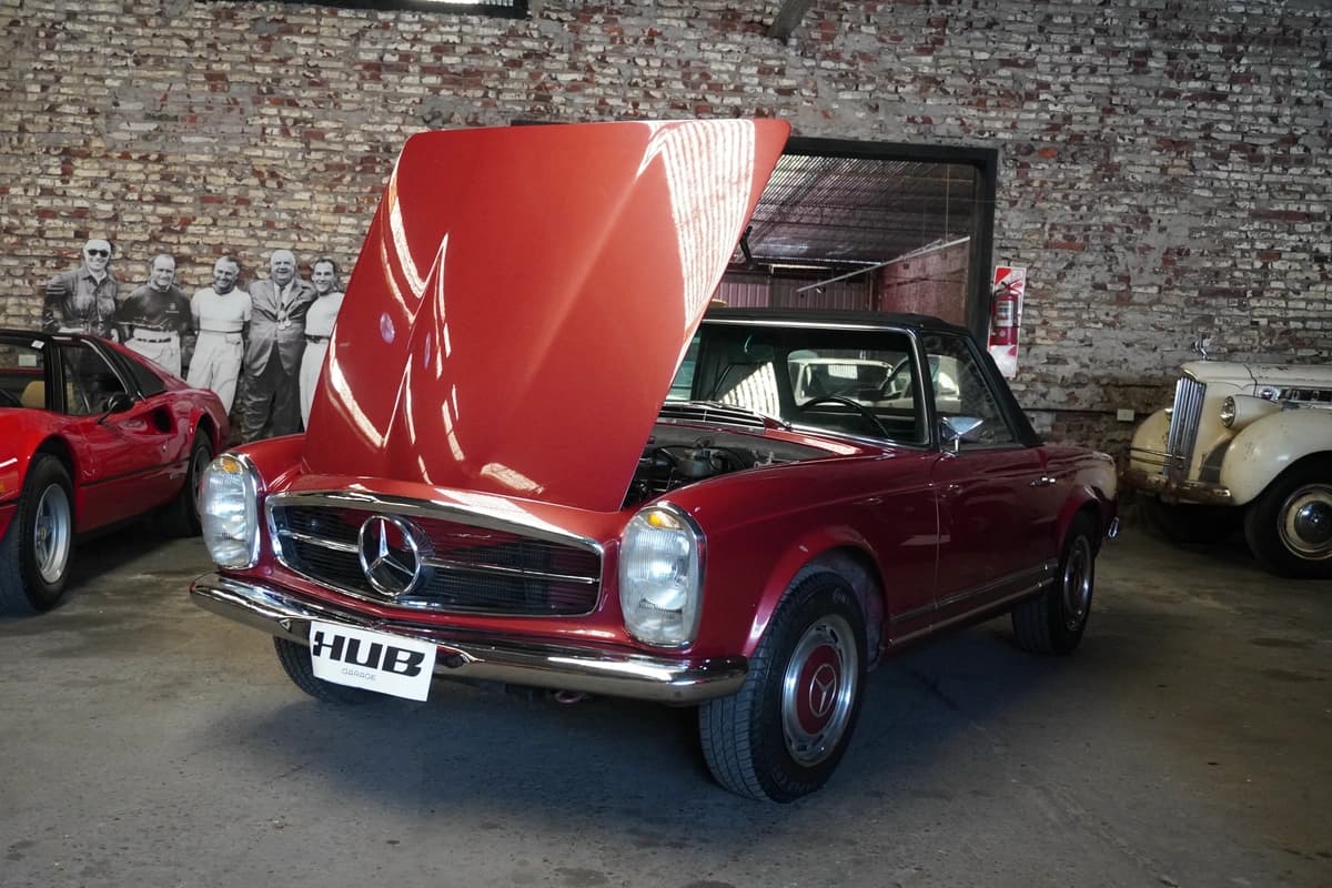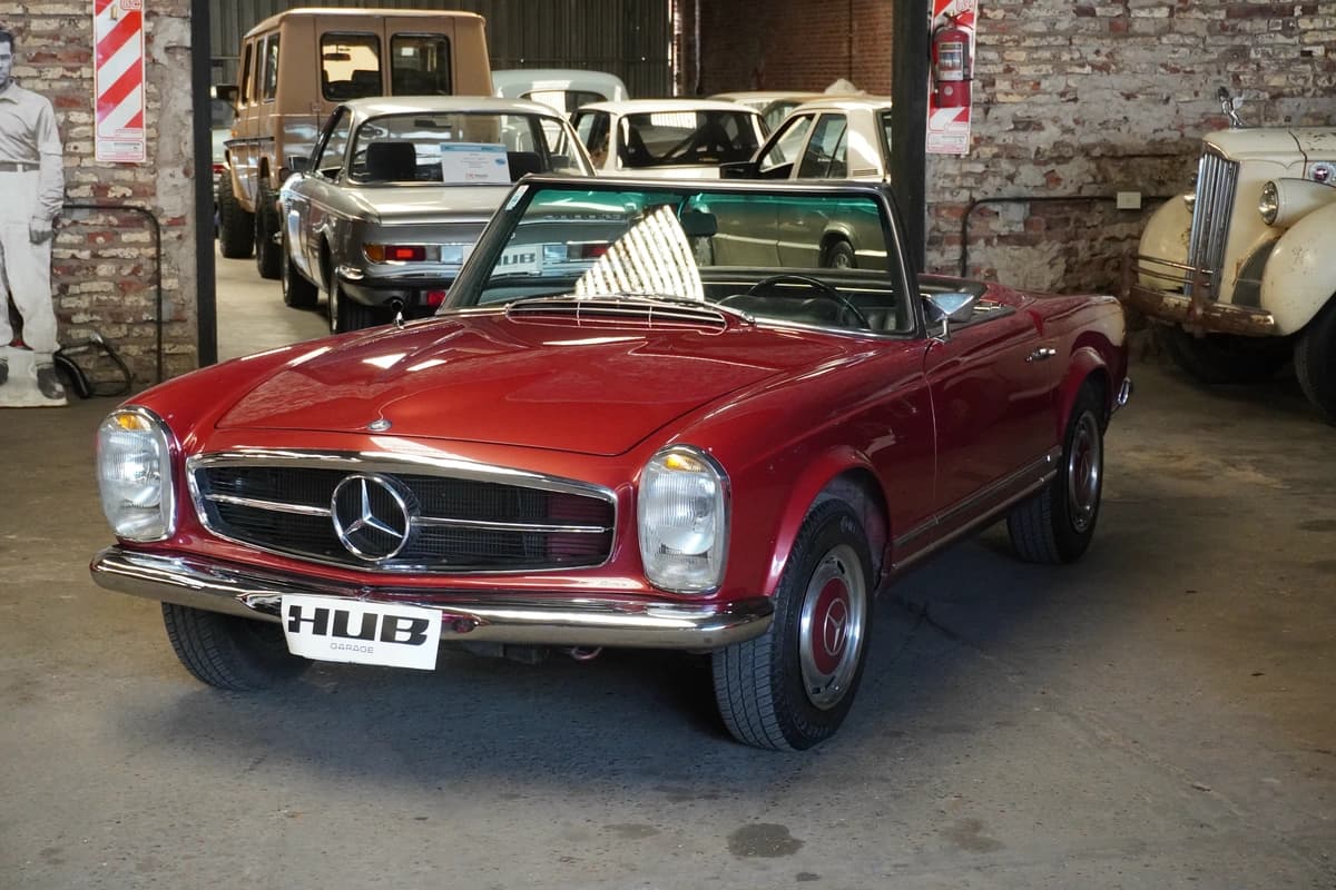 La 280SL, introducida en 1967, representa la evolución final y más refinada de la serie W113. Incorporó el motor seis cilindros en línea de 2.8 litros, con inyección mecánica Bosch, que ofrecía mayor potencia y suavidad respecto a sus antecesores. Fue un modelo especialmente apreciado en mercados como Estados Unidos y Europa, y su llegada a Argentina fue siempre limitada, lo que vuelve a estos ejemplares particularmente escasos y valorados a nivel local.