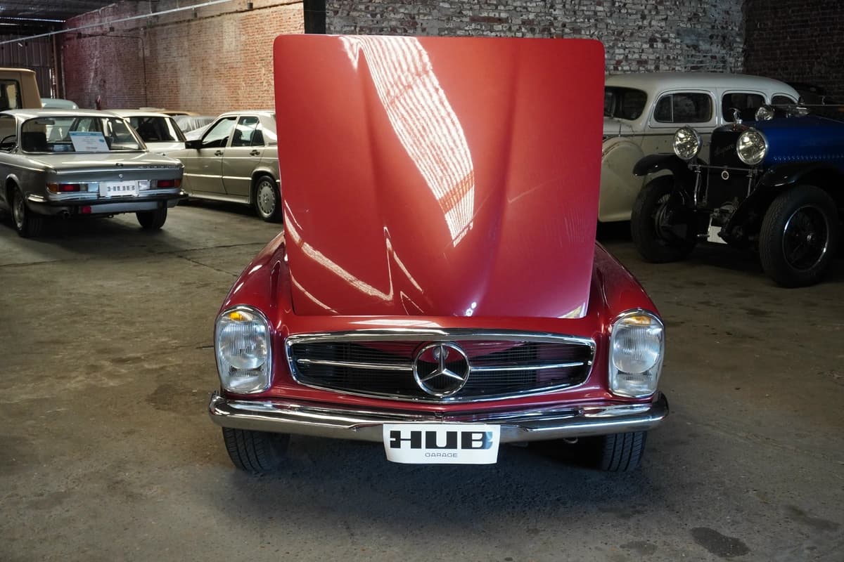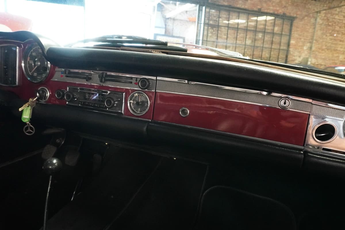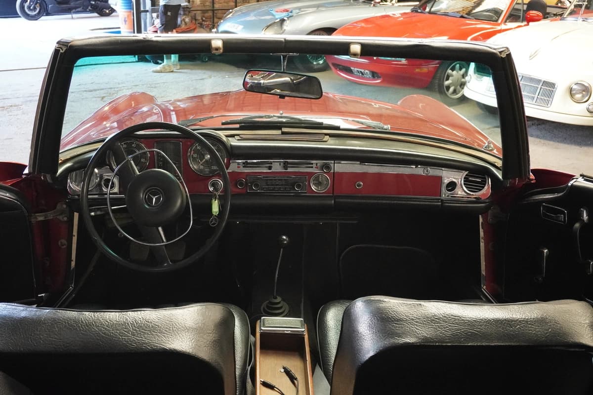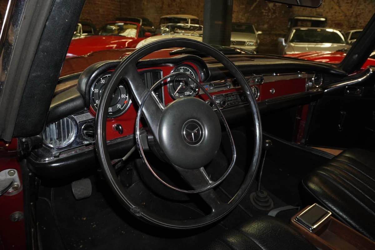 Esta unidad en particular es una Mercedes-Benz 280 SL del año 1968, con transmisión manual de 4 velocidades y solamente 83.291 kilómetros recorridos desde su creación. Se presenta en una atractiva combinación de color bordo con interior en cuero negro, acorde al espíritu elegante del modelo. El interior conserva su diseño original, con materiales, comandos y disposición originales y fieles a su configuración de fábrica, transmitiendo una sensación de solidez y refinamiento difícil de replicar en autos modernos.