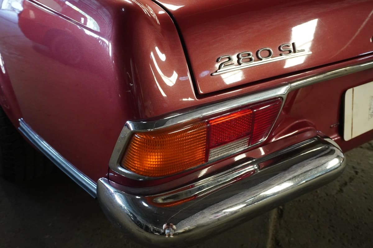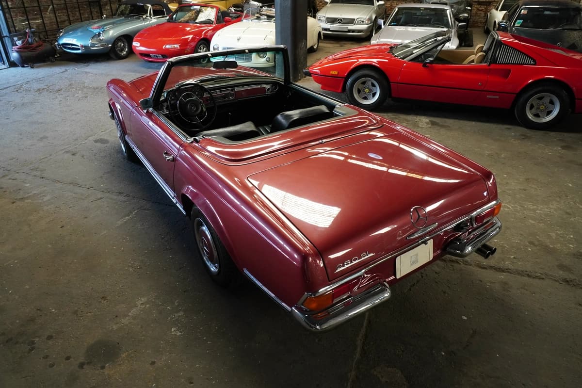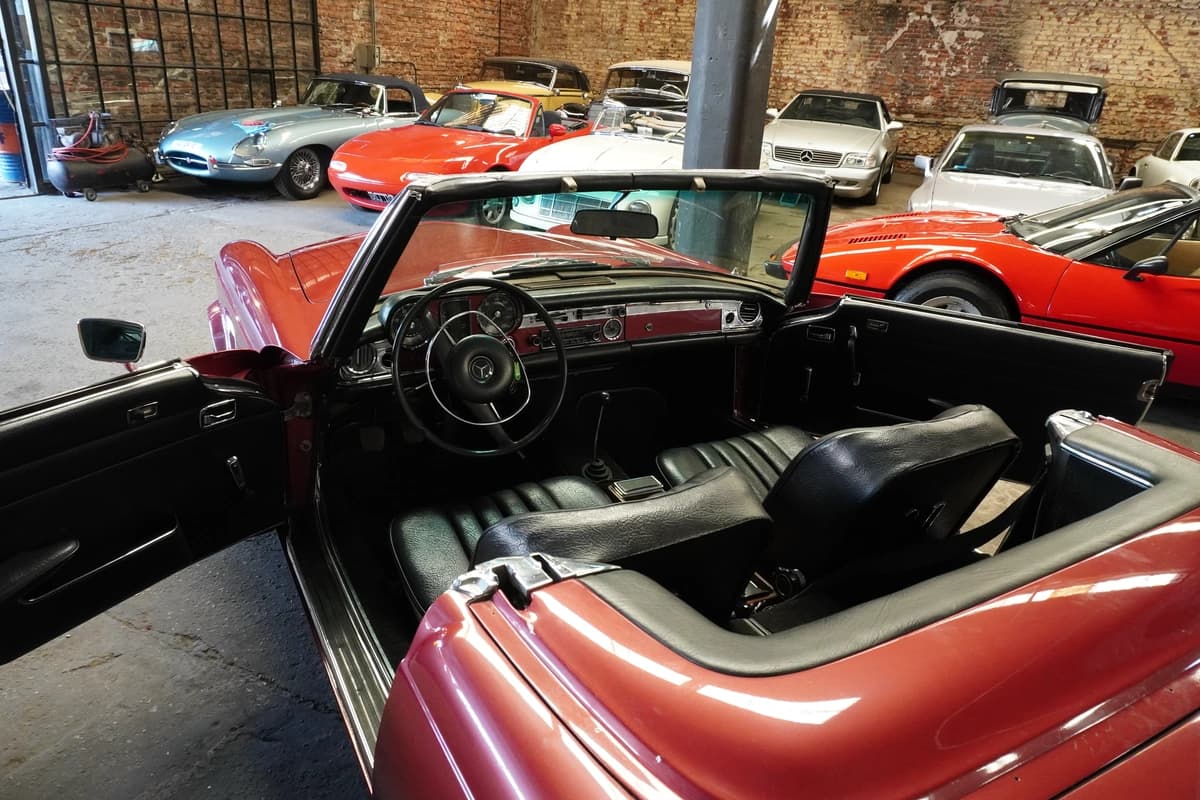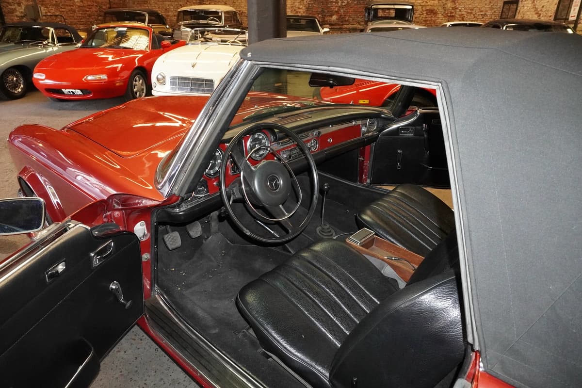 Esta unidad en particular es una Mercedes-Benz 280 SL del año 1968, con transmisión manual de 4 velocidades y solamente 83.291 kilómetros recorridos desde su creación. Se presenta en una atractiva combinación de color bordo con interior en cuero negro, acorde al espíritu elegante del modelo. El interior conserva su diseño original, con materiales, comandos y disposición originales y fieles a su configuración de fábrica, transmitiendo una sensación de solidez y refinamiento difícil de replicar en autos modernos.