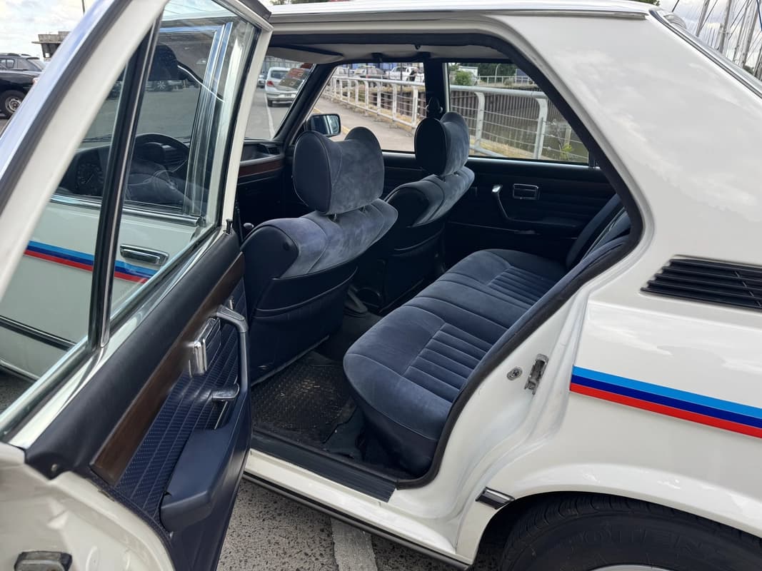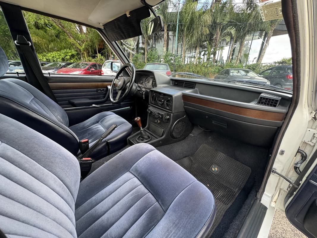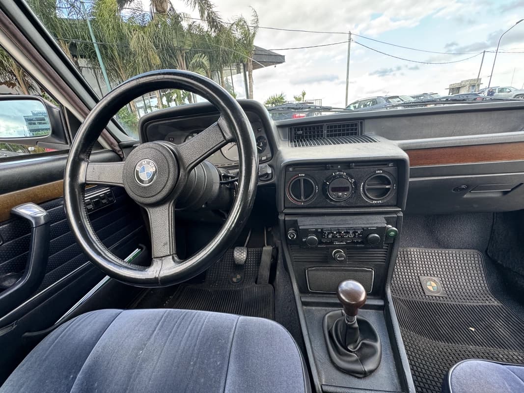 Por dentro, mantiene todo su interior original en pana azul, incluidos paneles, tablero, comandos y tapicerías. Conserva equipamiento notable para la época: levantavidrios eléctricos en las cuatro puertas, aire acondicionado, dirección hidráulica y volante sport BMW de tres rayos. El ambiente es el de una auténtica berlina bávara clásica: simple, sólida, bien construida, sin ruidos y con esa ergonomía intuitiva previa a la era digital.