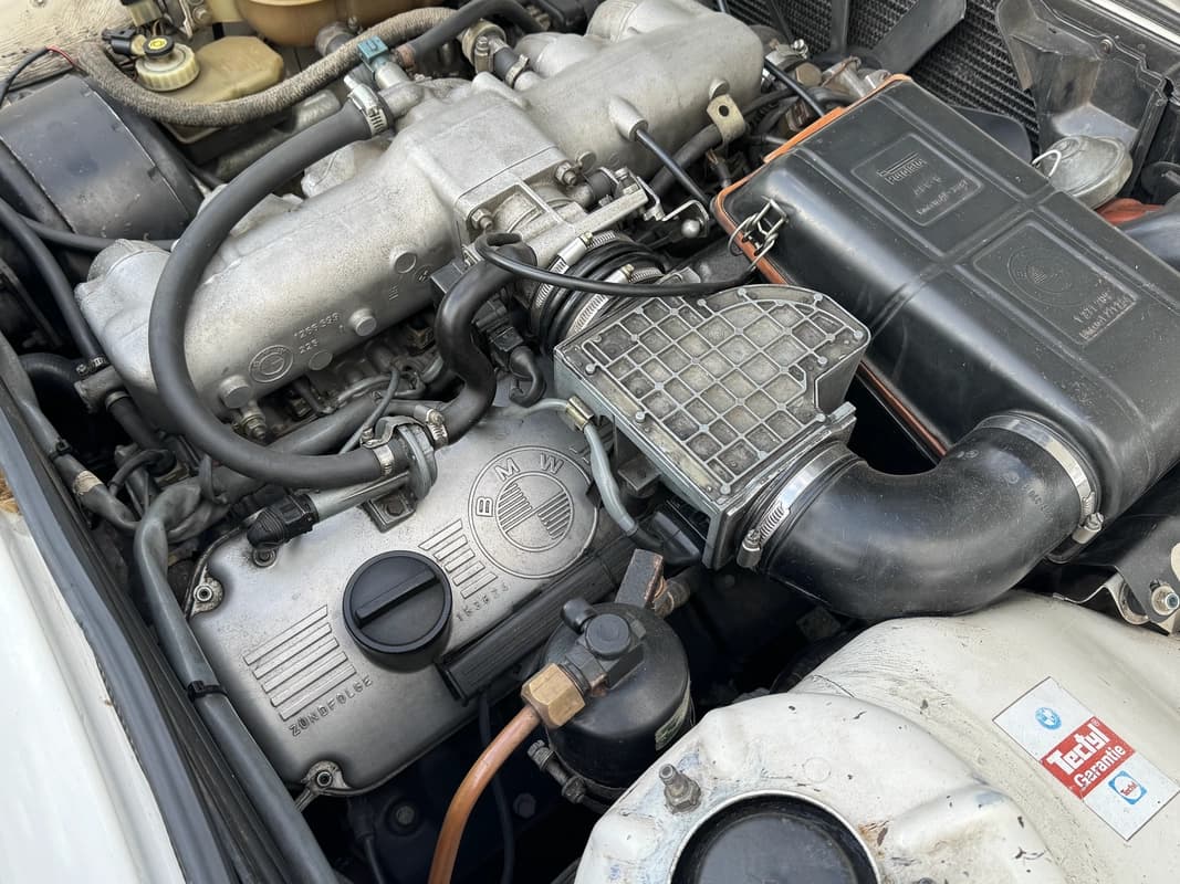 El corazón es el reconocido M30B28 de seis cilindros en línea y 184 cv, con inyección Bosch L-Jetronic original funcionando perfectamente. Está asociado a la caja manual dogleg de 5 marchas —con la primera abajo— una configuración típica de Alpina y M de la época, que transforma la experiencia de manejo. El diferencial autoblocante completa un conjunto mecánico que ofrece tracción trasera pura, respuestas lineales y un tacto que hoy prácticamente no existe en ningún sedán moderno.