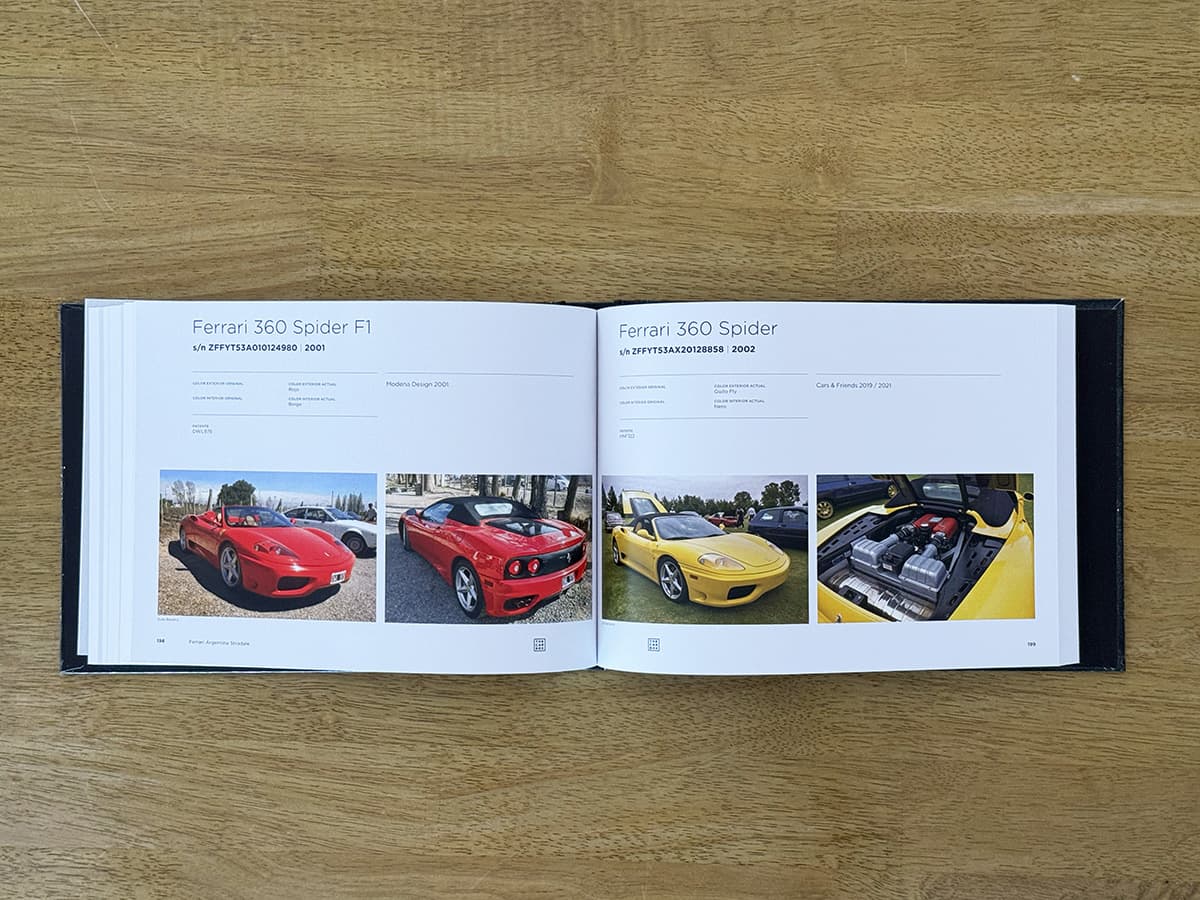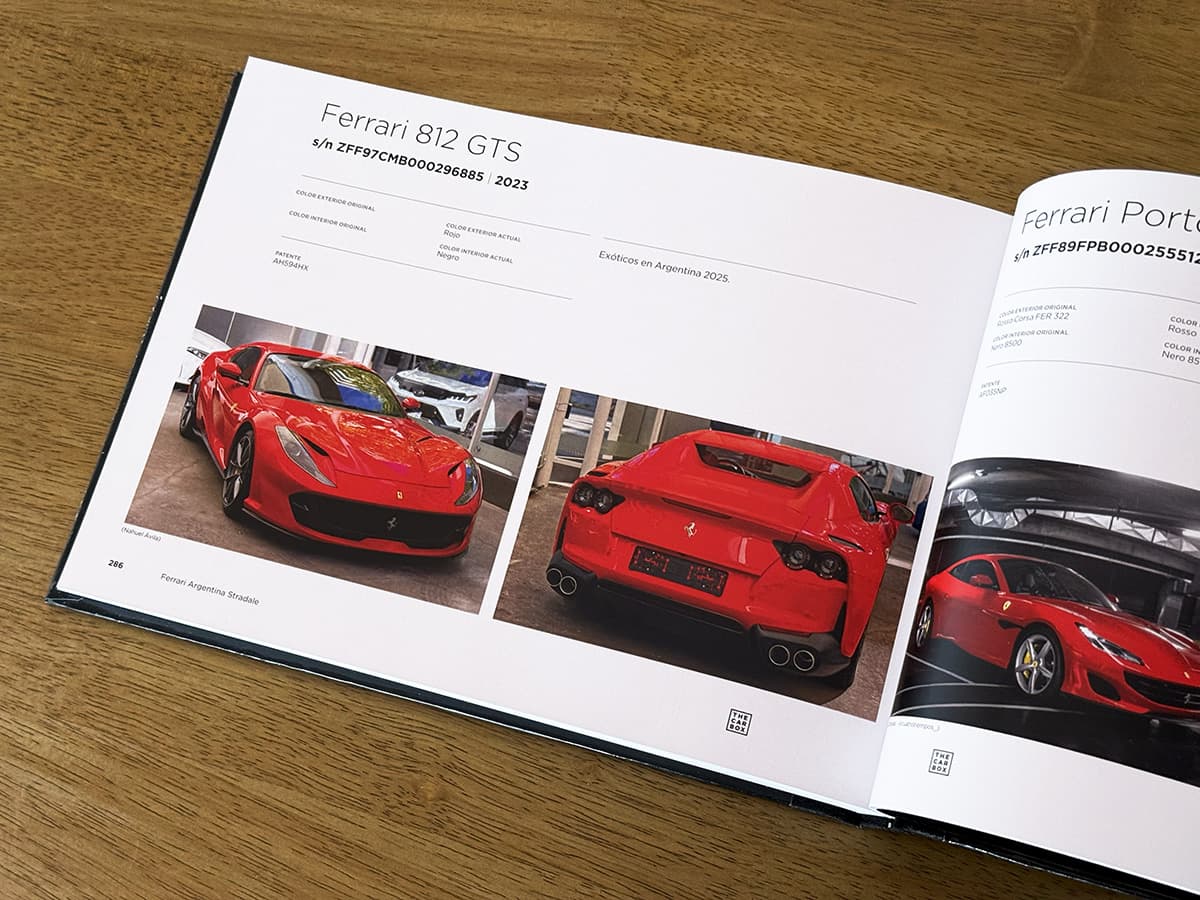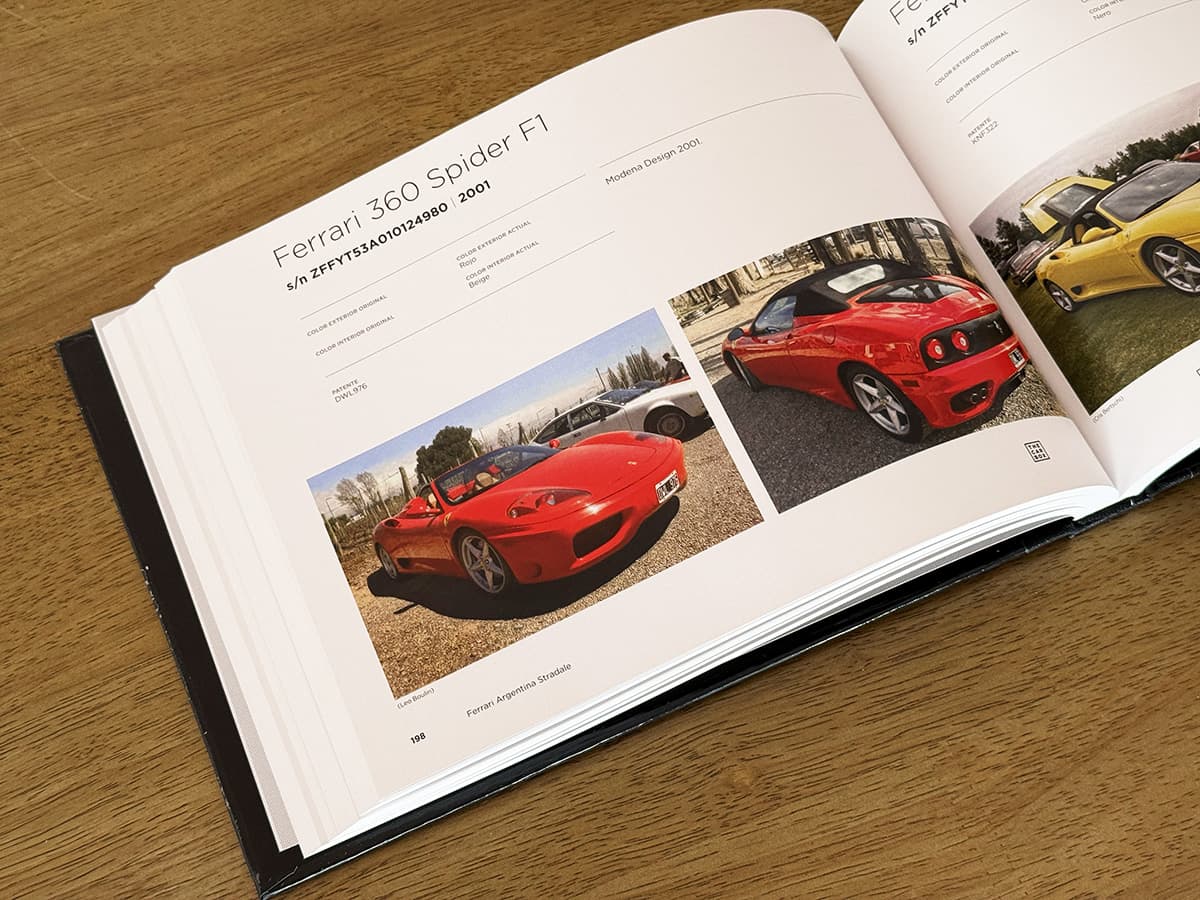 Este libro es exactamente lo que promete ser: un registro. Más de 300 páginas dedicadas exclusivamente a Ferrari de calle que viven actualmente en Argentina. Cada auto ocupa una página completa, con dos fotografías y sus datos principales, permitiendo recorrer cronológicamente la historia de la marca en el país. Desde las primeras Ferrari prácticamente míticas, hasta ejemplares contemporáneos, pasando por períodos clave como la era Auto Giallo, Gruppo Modena y Centro Milano, este libro funciona tanto como documento histórico como objeto de consulta permanente.