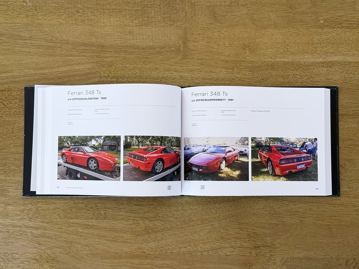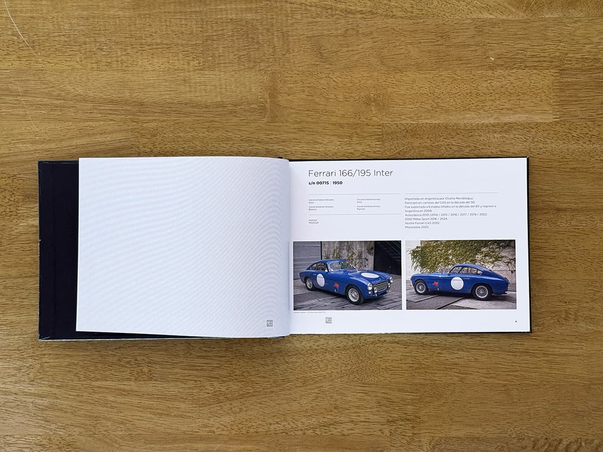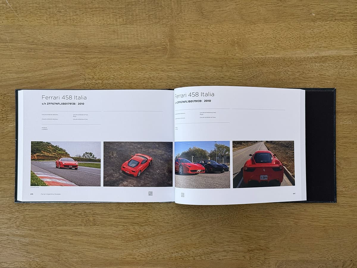 Este libro es exactamente lo que promete ser: un registro. Más de 300 páginas dedicadas exclusivamente a Ferrari de calle que viven actualmente en Argentina. Cada auto ocupa una página completa, con dos fotografías y sus datos principales, permitiendo recorrer cronológicamente la historia de la marca en el país. Desde las primeras Ferrari prácticamente míticas, hasta ejemplares contemporáneos, pasando por períodos clave como la era Auto Giallo, Gruppo Modena y Centro Milano, este libro funciona tanto como documento histórico como objeto de consulta permanente.
