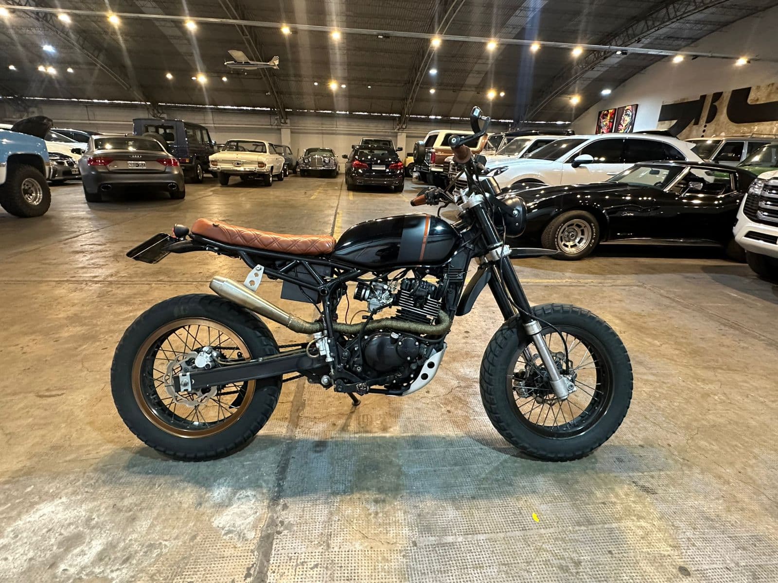 Entre los puntos destacados del proyecto se encuentran el tapizado de cuero marrón estilo scrambler, el escape con estética scrambler, y una coherencia general en cada elemento visual. No es una moto improvisada: el trabajo de modificación fue bien ejecutado, con criterio estético claro y buen gusto, logrando un conjunto equilibrado y muy atractivo.